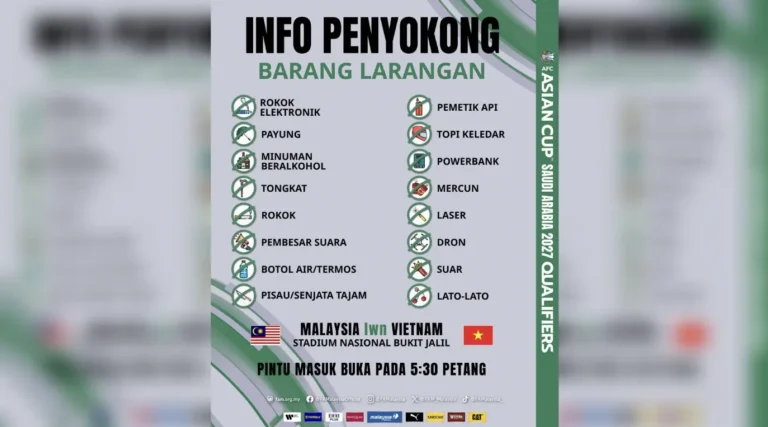 Menjelang aksi Kelayakan Piala Asia 2027 Malaysia bertemu Cape Verde malam ini, ini perkongsian mengenai barang-barang yang tidak dibenarkan dibawa masuk ke dalam Stadium Nasional Bukit Jalil.