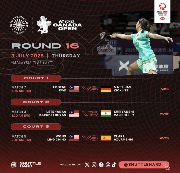 K. Letshanaa, Eogene Ewe dan Wong Ling Ching berjaya mengharungi cabaran pusingan 32 terbaik di Kejohanan Terbuka Kanada untuk merialisasikan impian mara ke peringkat suku akhir kejohanan.